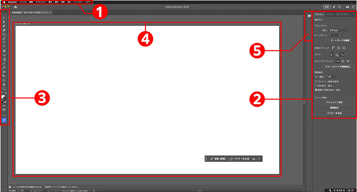 Illustratorを起動してファイルを開くと、以下のような画面が表示されます。 画面は大きく分けて5つのエリアで構成されています。