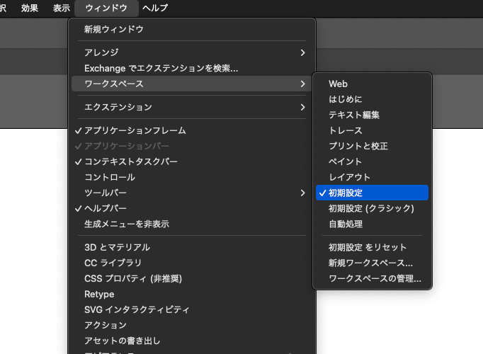 「解説サイトの画面と、自分の画面が違う!」 「パネルを消してしまって元に戻せない!」 そんな時は、ワークスペースを初期状態にリセットしましょう。画面右上にある「ワークスペース切り替えボタン」をクリックすると、一覧が表示されます。 初心者の方におすすめなのは「初期設定(クラシック)」です。 昔ながらのレイアウトで、必要なツールやコントロールバーが最初から表示されているため、迷子になりにくいのが特徴です。もしパネルがぐちゃぐちゃになってしまった場合は、同じメニューの下にある「(ワークスペース名)をリセット」をクリックすれば、一瞬で綺麗な初期配置に戻ります。