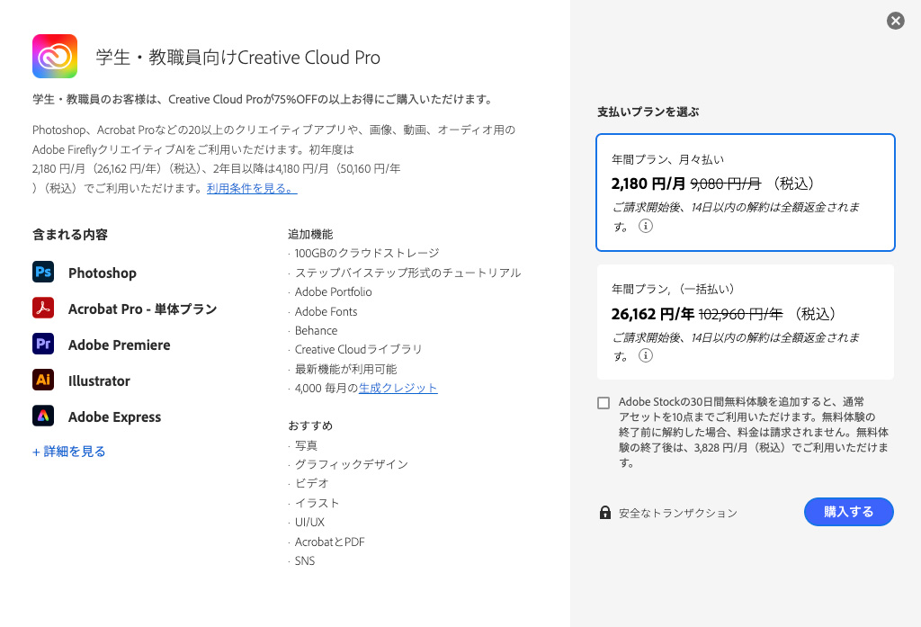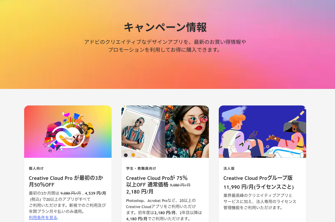 学生や教職員であれば、コンプリートプランを最大65%OFF以上の割引価格で利用できます。社会人であっても、Adobe認定のオンラインスクールや通信制大学(放送大学など)に在籍することで、この学割プランを利用できる裏技的な方法もあります。