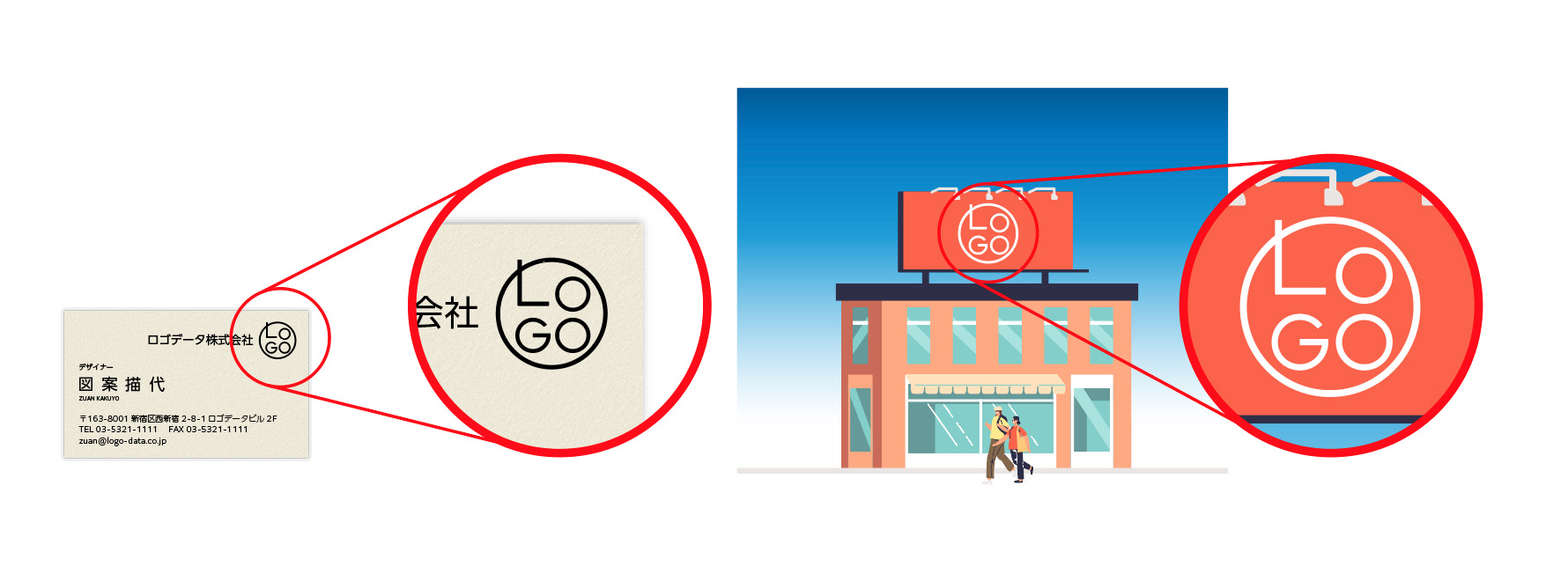 名刺サイズのロゴを、看板サイズに引き伸ばしても美しいまま。何度修正しても線がぼやけない